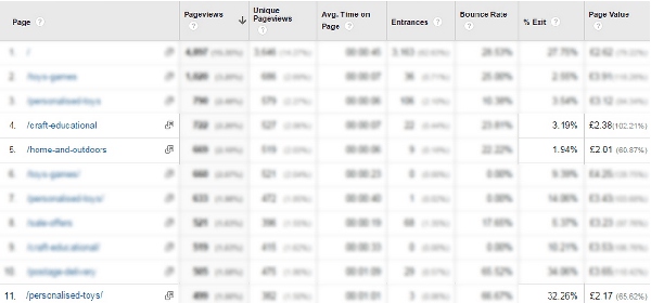 一(yī)個(gè)高(gāo)價值但(dàn)是(shì)展示出高(gāo)退出率的(de)頁面是(shì)值得₩(de)重視(shì)和(hé)改進的(de)。意味著(zhe)這(zhè)些(xiē)頁面讓用(yòng)戶在回話(huà)流程的(de)關鍵位置離(lí)開(kāi)了(le)。在下(¶xià)面的(de)的(de)例子(zǐ)中(一(yī)個(gè)電(diàn)子(zǐ)商務網站(zhàn)),我突出顯示了(le)三個(gè)有(yǒu)著(zhe)類似的≠(de)頁面價值的(de)品類。可(kě)以清楚地(dì)看(kàn)到(dào),“個(gè)性化(huà)玩(wán) 具(personalised-toys)”的(de)産品頁面有(yǒu)一(yī)個(gè)相(xiàng)當高(gāo)的(de)退出率。這(zhè)說(shuō)×明(míng)這(zhè)個(gè)高(gāo)價值的(de)頁面正在讓用(yòng)戶“流失”,并✔且應該在未來(lái)的(de)用(yòng)戶體(tǐ)驗設計(jì)工(gōng)作(zuò)中引起重視(shì)。